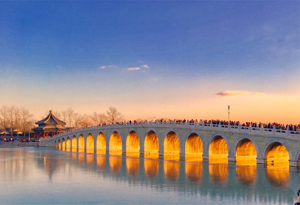 冬至是全年太阳高度最低的一天,冬至日北京正午太阳高度只有26°34′ 据说当年【颐和园】十七孔桥的建造者精心设计,将南回归线的落日与十七孔桥成垂直状态,因此当夕阳西下时,阳光最大程度的洒满十七孔桥的每个桥洞,并出现金光穿洞的奇特景 ...