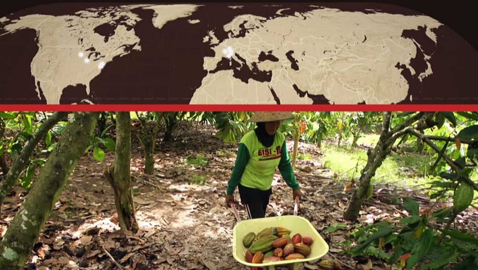 Originaire d’Amérique du Sud, le cacao des Mayas et des Aztèques s’implante ensuite en Afrique avec les colons européens. Aujourd’hui, la fringale de chocolat est mondiale et ne met plus seulement en appétit l’occident, car même la Chine et l’Inde en découvrent la saveur. Un engouement qui ne profite pas suffisamment aux deux principaux pays producteurs : la Côte d’Ivoire et le Ghana.